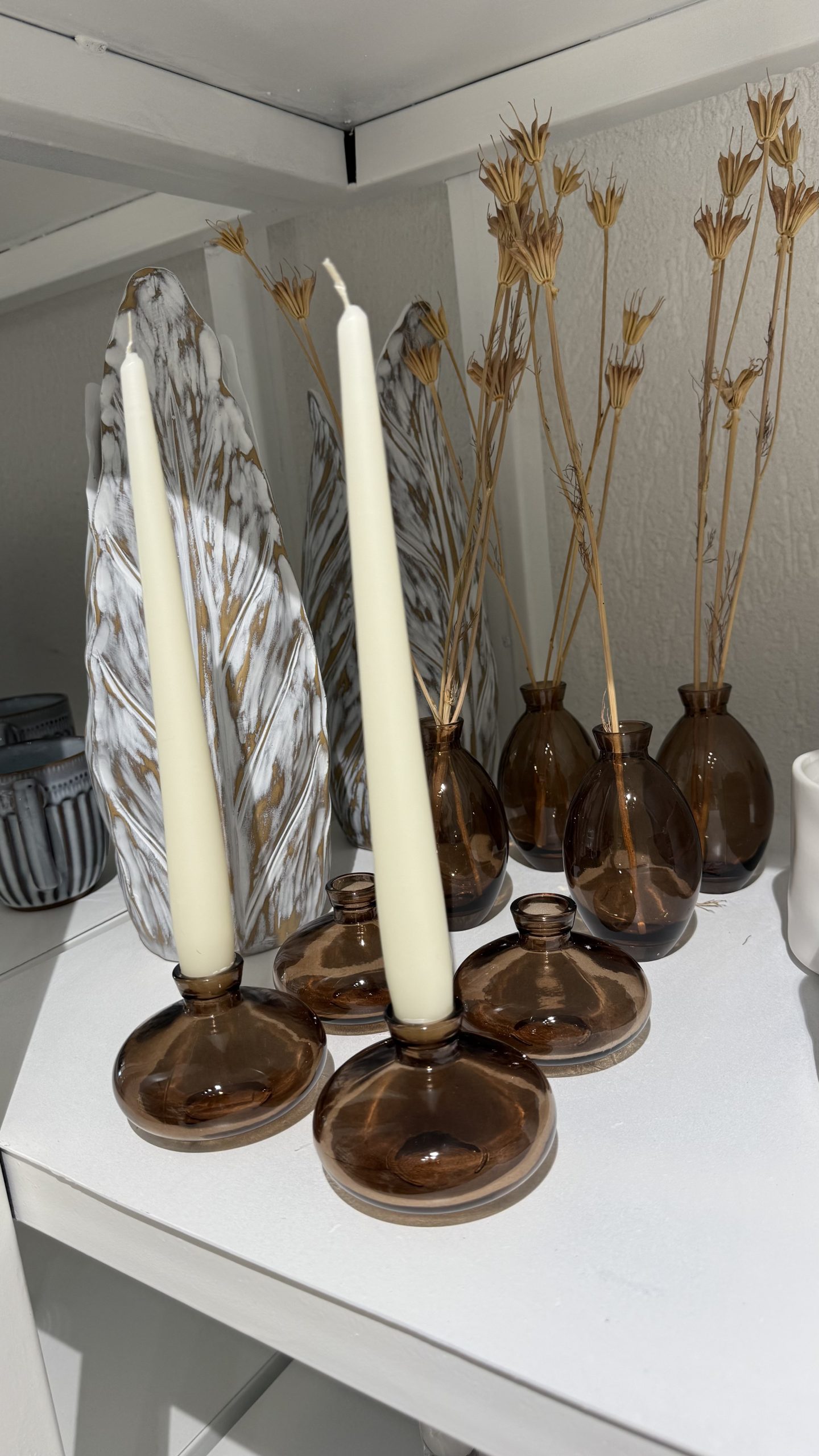 כמות של ואזה זכוכית חומה לפרחים ונרות
