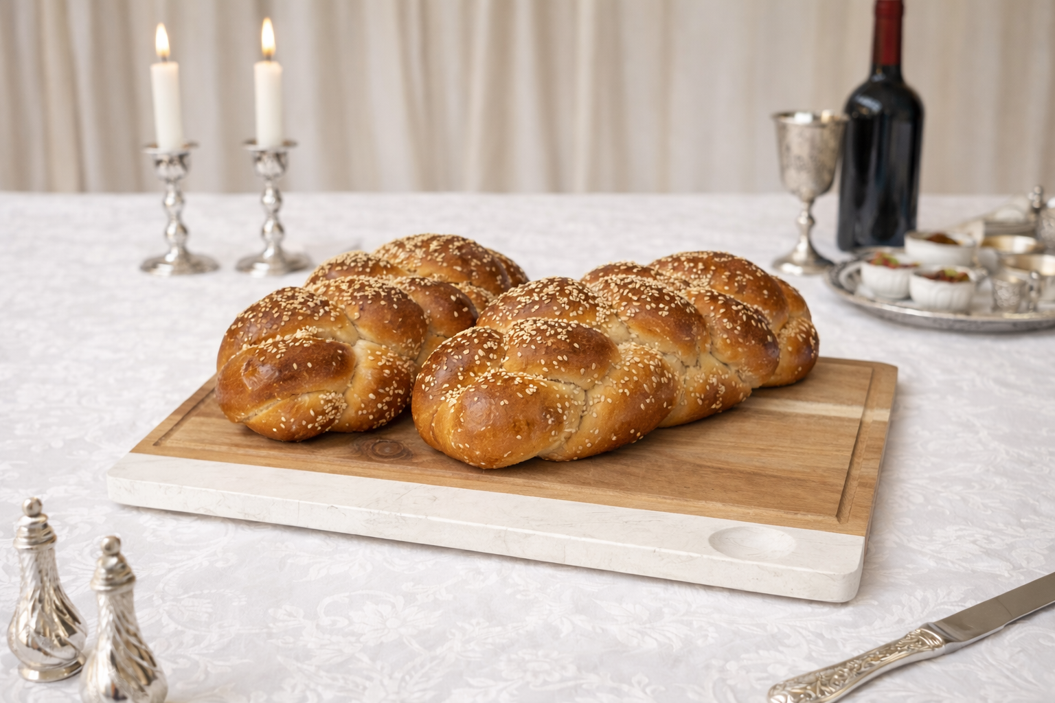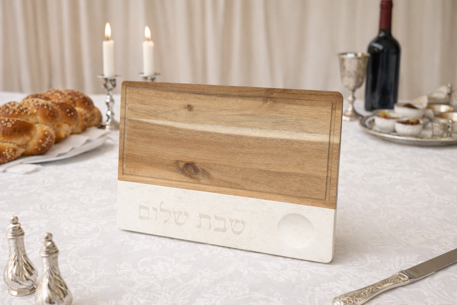 מגש שבת עץ בשילוב שייש עם כיתוב שבת שלום