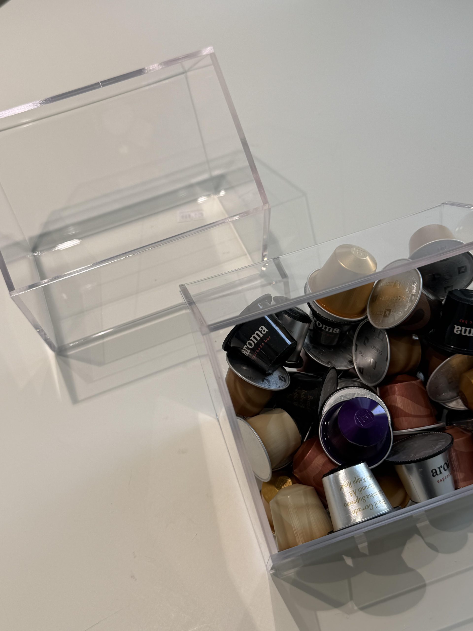 מעמד אקריל לקפסולות קפה עם חור מרכזי גדול, המאפשר השחלה נוחה ומהירה של הקפסולות.