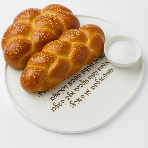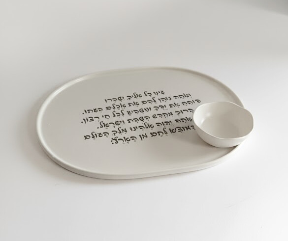 מגש קרמי שמגיע עם צלוחית תואמת למלח, בעיצוב קלאסיי ונקי, שמכניס שלווה ואסתטיקה לכל שולחן שבת.