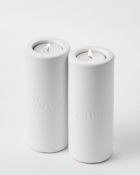 זוג פמוטים מבטון עם כיתוב שבת שלום מתאים לנרות שבת