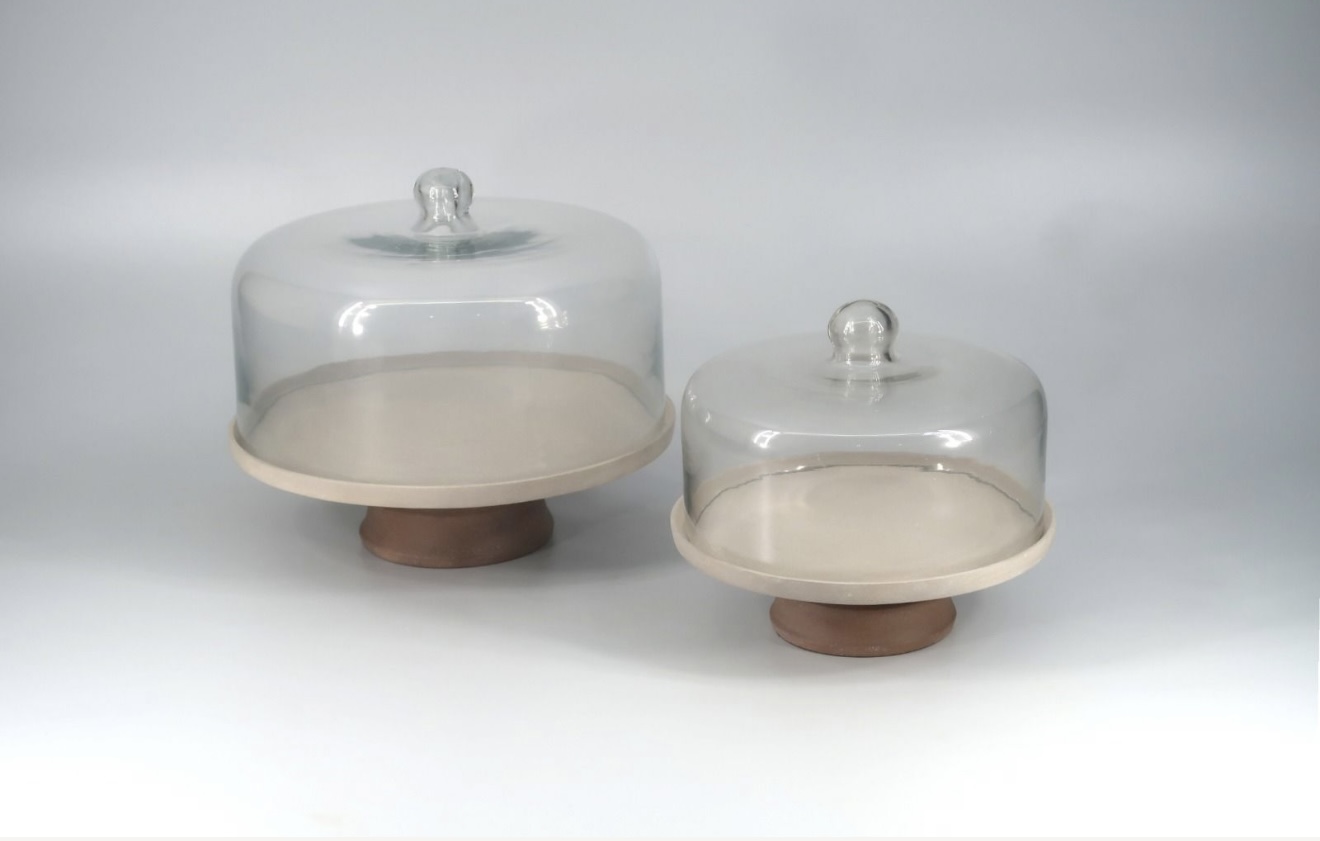 פעמון זכוכית עם רגל קרמיקה בצבע בז עם חום