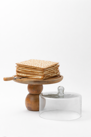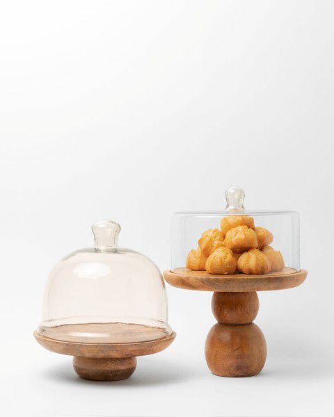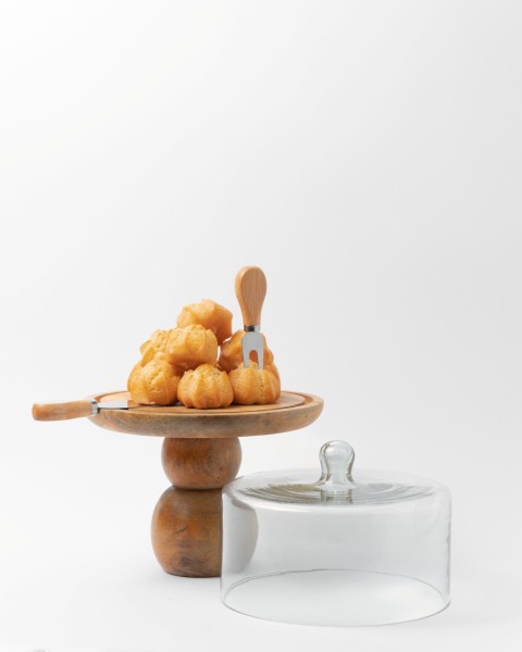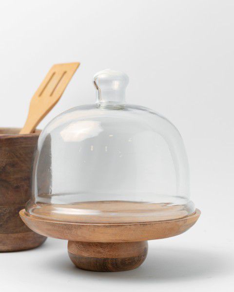 מגש יוקרתי מעץ מנגו בגימור טבעי, מגיע בשילוב פעמון זכוכית שקוף, המגן על הטריות ומשדרג כל שולחן באלגנטיות.