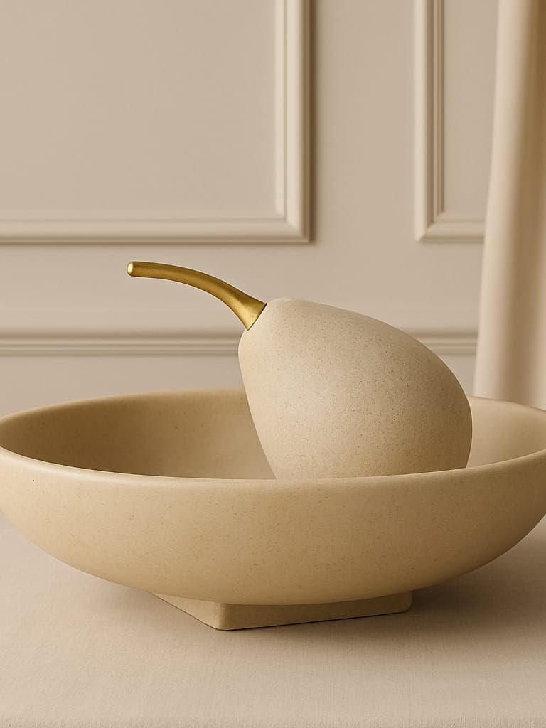 קערת אבן מעוצבת בשילוב דקורטיבי של תפוח ואגס, בגוון לבן אבן נקי וטבעי.