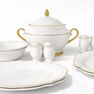 סט צלחות לבן גימור פרחים עם פס זהב